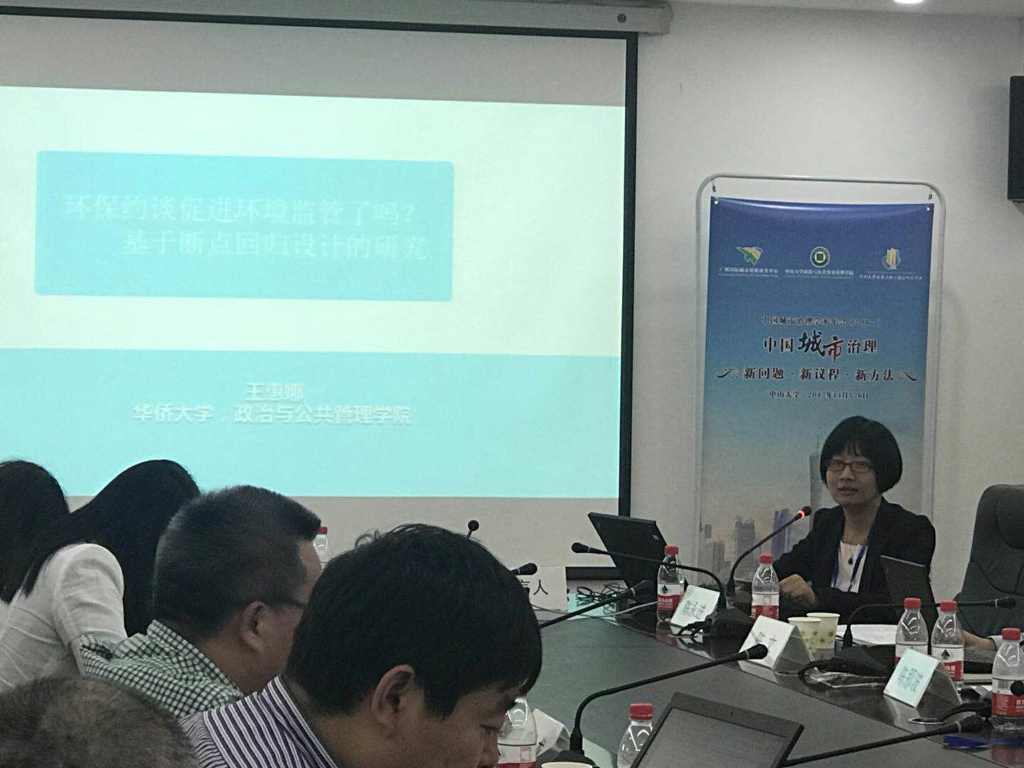在主题演讲环节,入选论文的作者分别做了主题报告。王惠娜副教授在第四场主题演讲中,做了《环保约谈促进环境监管了吗?基于断点回归设计的研究》的主题报告,并与参会专家进行讨论。