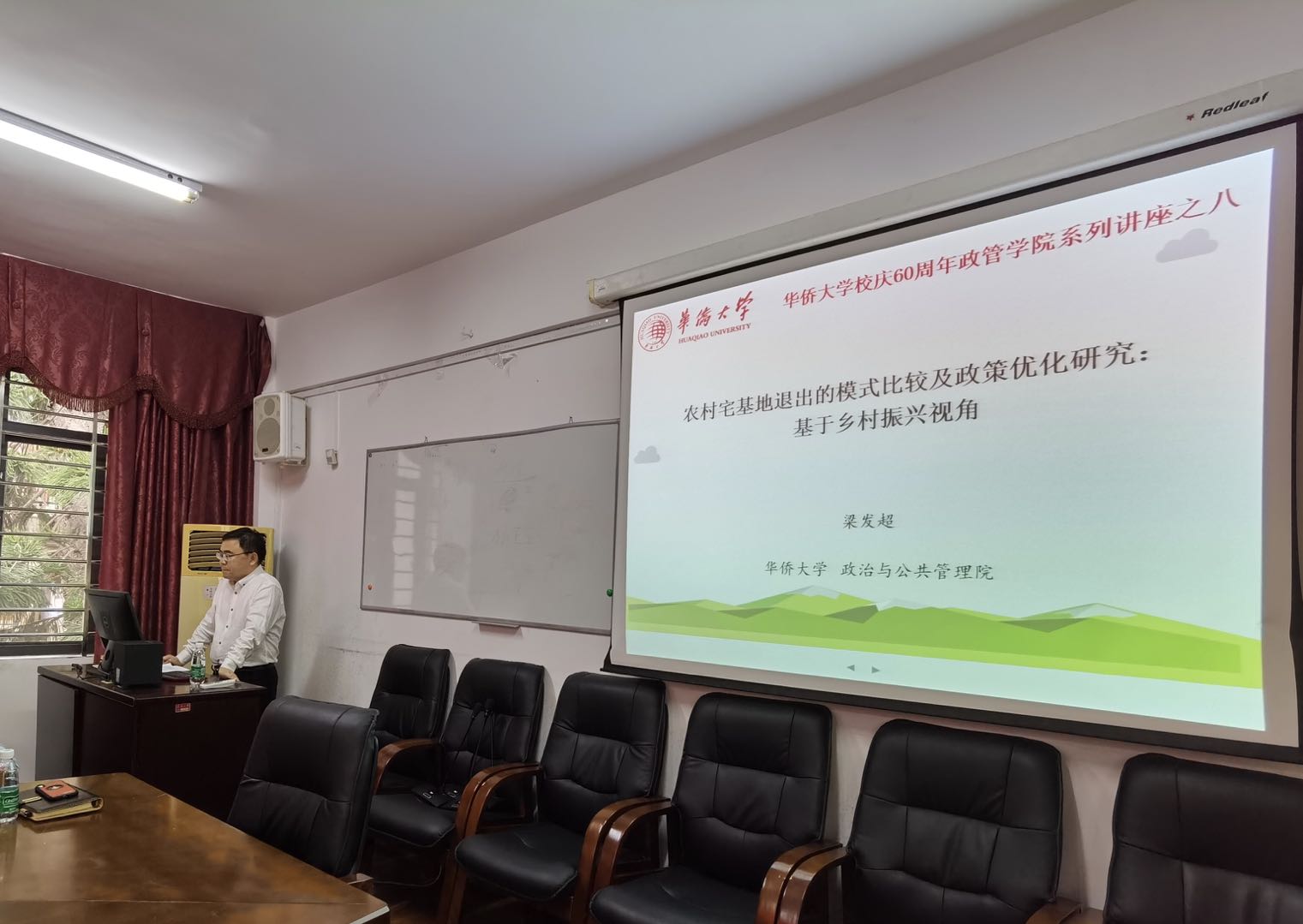 11月6日下午,华侨大学校庆60周年政管学院系列讲座第八讲,在华侨大学政治与公共管理学院二楼会议室召开。政治与公共管理学院梁发超教授做了“农村宅基地有偿退出的模式比较及政策优化:基于乡村振兴视角”的主题讲座。