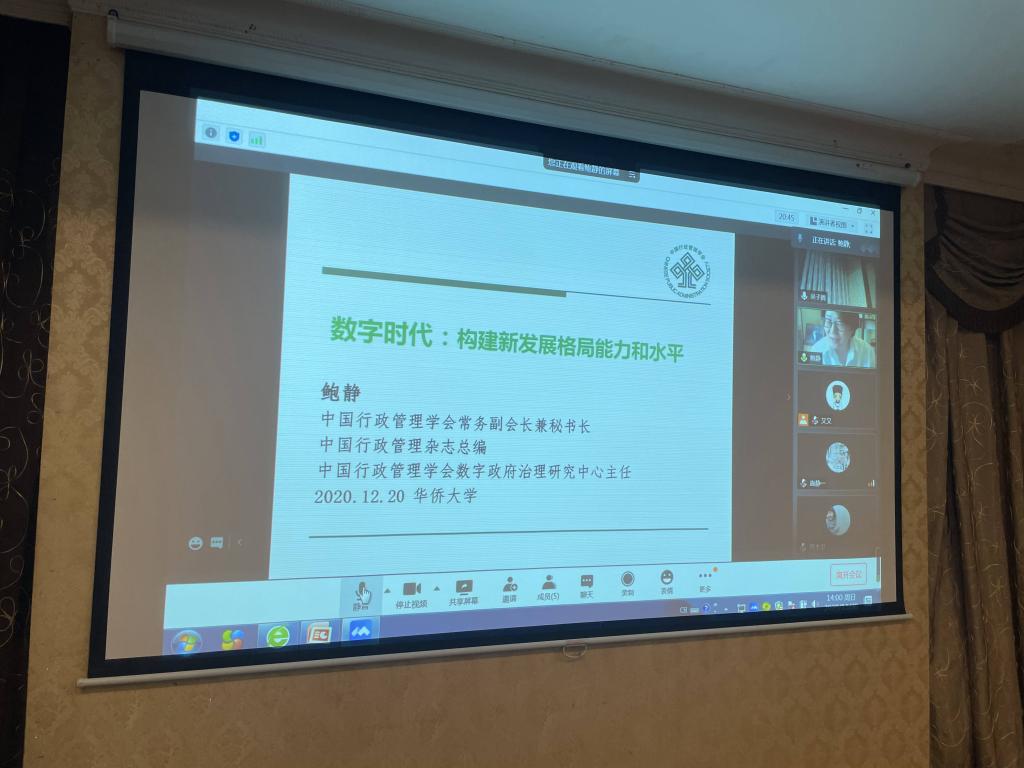 2020年12月20日下午,第94讲公共管理名家讲坛在华侨大学政治与公共管理学院开讲。主讲嘉宾为中国行政管理学会常务副会长兼秘书长、中国行政管理杂志社总编、中国行政管理学会数字政府治理研究中心主任鲍静研究员,讲座的题目为《数字时代:构建新发展格局能力和水平》。本次讲座由我院院长汤兆云教授主持,我院部分教师和研究生线上参加了此次讲座。