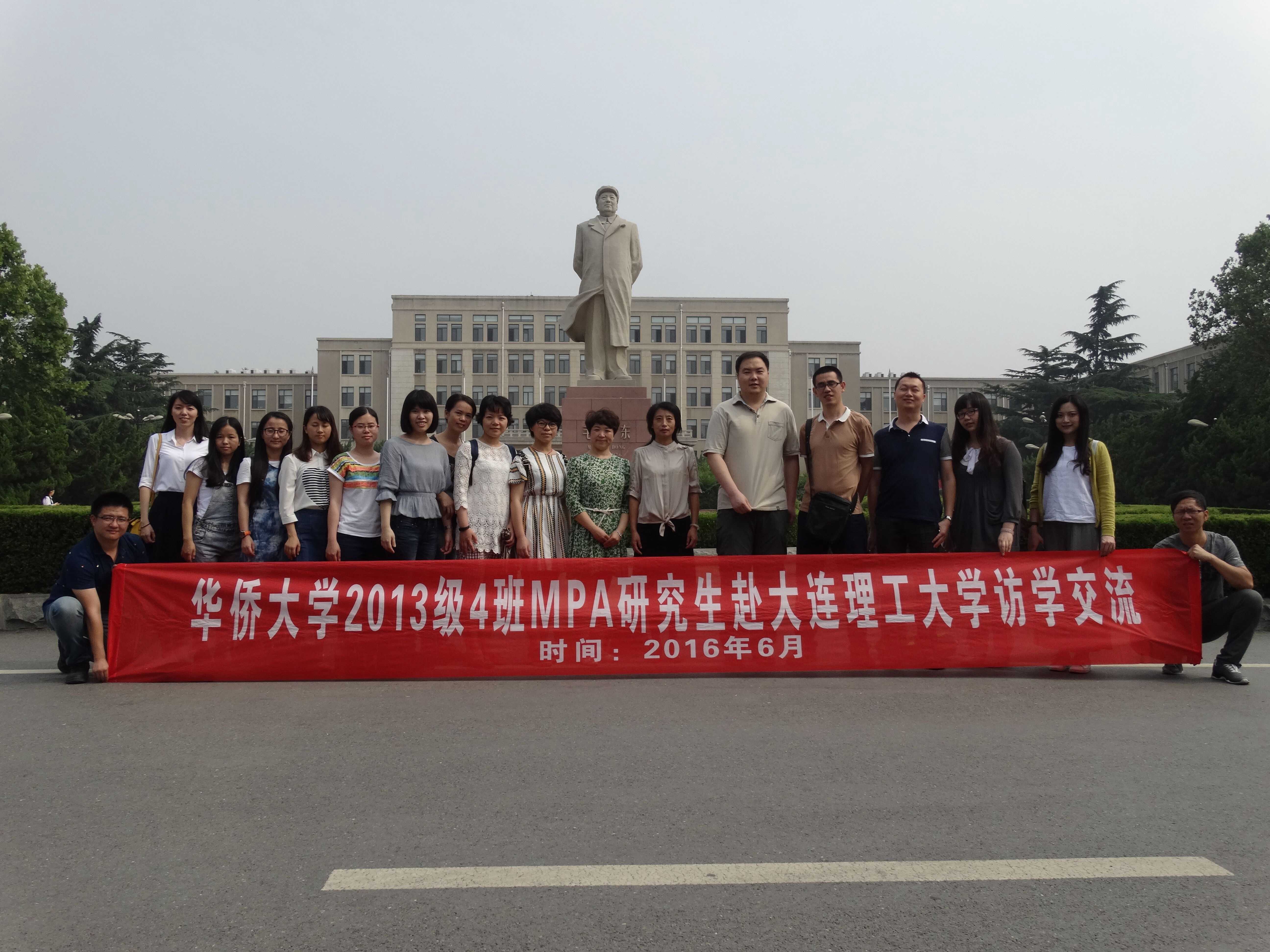 在大连理工大学MPA教育中心的大力支持下,2016年6月27日,华侨大学政治与公共管理学院公共管理硕士(MPA)2013级4班一行15人,在学院姜泽华老师和邹利林老师的带领下,赴大连理工大学和大连市西岗区365市民中心进行访学与交流。