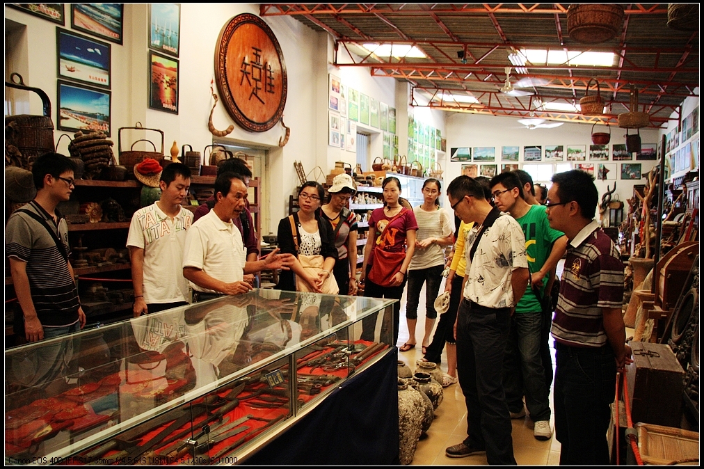 在接下来的参观中,我们逐一寻找到了答案。参观的第二站是滨海沙生植物园,这是一个具有独立法人的民营科技型企业单位。设立了科普教育展览厅、珍稀果树母本园、沙生药用植物引种园、观赏花卉景观园、优良蔬莱引种园、引种推广示范园、淡水养殖示范池、防沙固沙植物园、亚热带沙生植物园、温室荫棚驯化园等10个功能区,是全国唯一的滨海沙生植物园。在退休老校长的介绍下,大家对这些“新”、“奇”的植物知识有了更深的了解,最妙的是植物园内还设置了闽台民俗馆,有别于泉州的闽台缘博物馆,它是一个地地道道的农民收藏馆,馆内收藏品达240多类、1万余件,让我们对这个既是休闲旅游景点,又是科普宣教基地啧啧称叹,领略了东山农民创业产业的发展渠道。