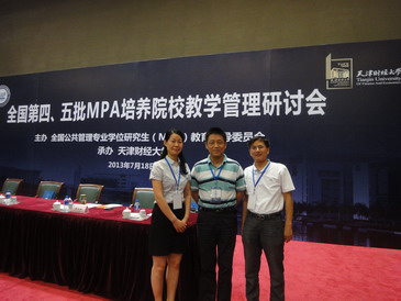 我院MPA教育中心副主任侯志阳博士、MPA教育中心办公室主任陈丽蓉老师参加2013年7月18日-19日在天津召开的全国第四、五批MPA培养院校教学管理研讨会。本次会议由全国公共管理专业学位研究生(MPA)教育指导委员会主办、天津财经大学承办。全国MPA教育指导委员会副主任委员、国家公务员局培训与监督司刘丽军司长、国务院学位委员会办公室专业学位研究生教育处陆敏处长、全国MPA教育指导委员会秘书长董克用教授以及来自全国52所高校MPA教育中心的负责人参加会议。会议采取主题发言、经验交流、小组讨论等形式,与会高校代表提交相应的工作总结,进行对话、交流,大家取长补短、共同进步。