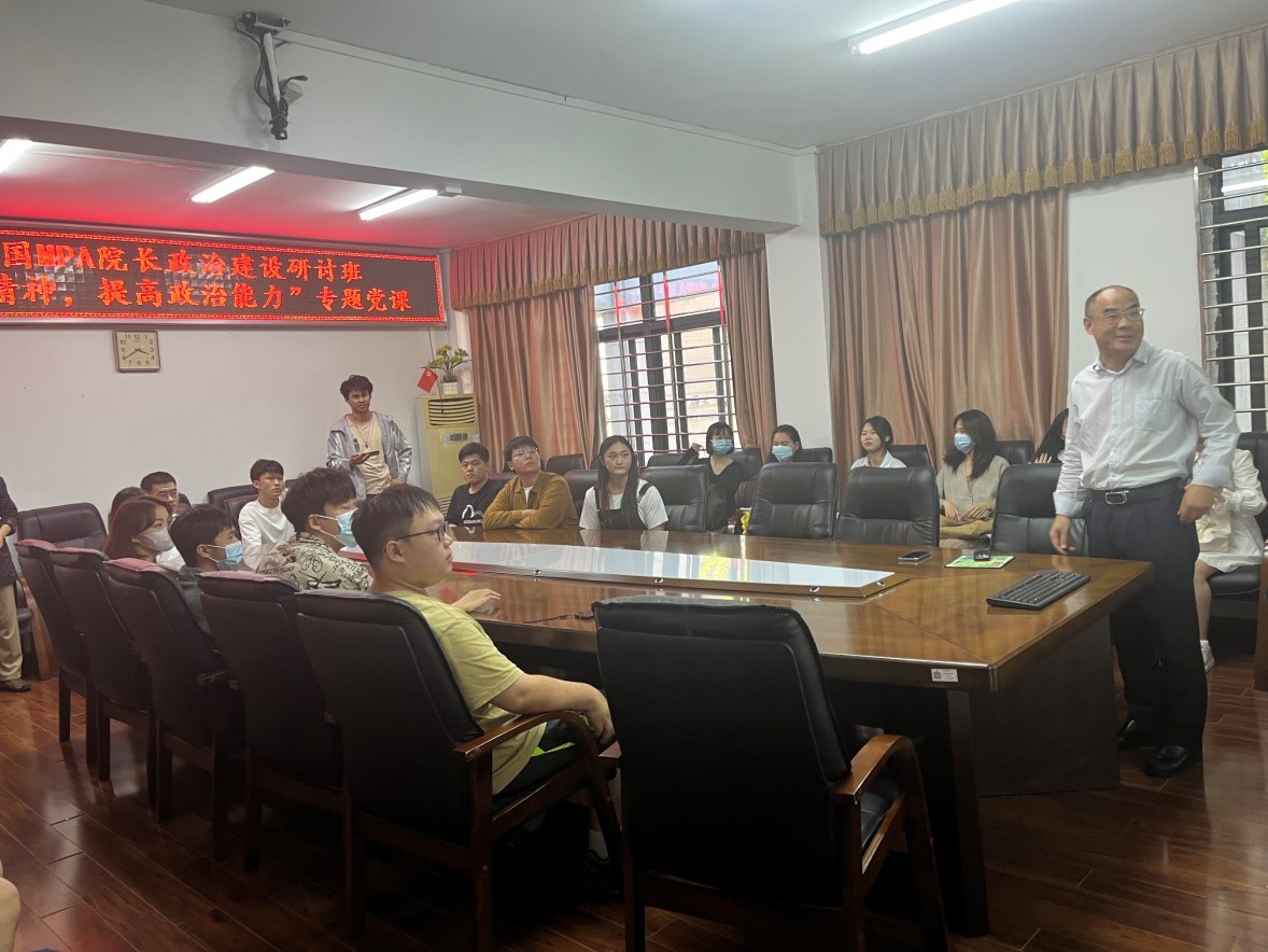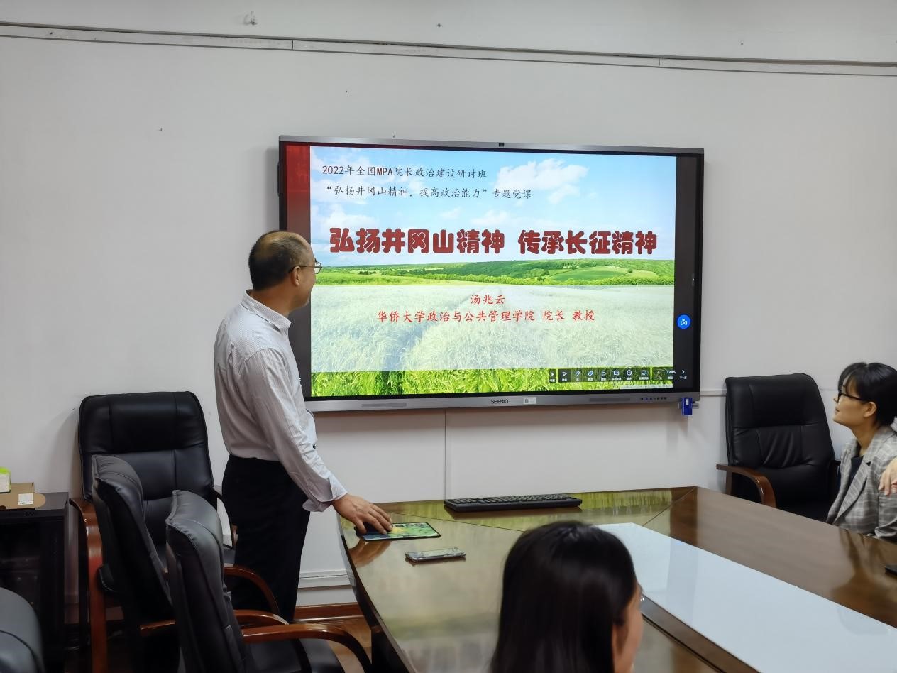 为进一步落实和宣传本次研讨班的主要内容和重要精神,2022年10月20日下午,2022年全国MPA院长政治建设研讨班“弘扬井冈山精神,提高政治能力”专题党课进行,本次党课主题为“弘扬井冈山精神,传承长征精神”,由华侨大学政治与公共管理学院教授、公共管理硕士(MPA)教育中心主任汤兆云主讲。学院部分老师、硕士研究生参加了本次党课。